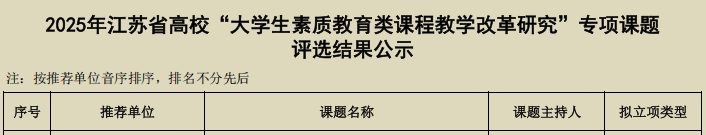 近日,江苏省高等教育学会发布《2025年江苏省高校“大学生素质教育类课程教学改革研究”专项课题评选结果公示》,拟立项建设专项课题193项,涵盖重点课题14项、一般课题178项(含经费自筹95项)。我校两项课题成功入选,彰显了在素质教育课程改革领域的研究实力。